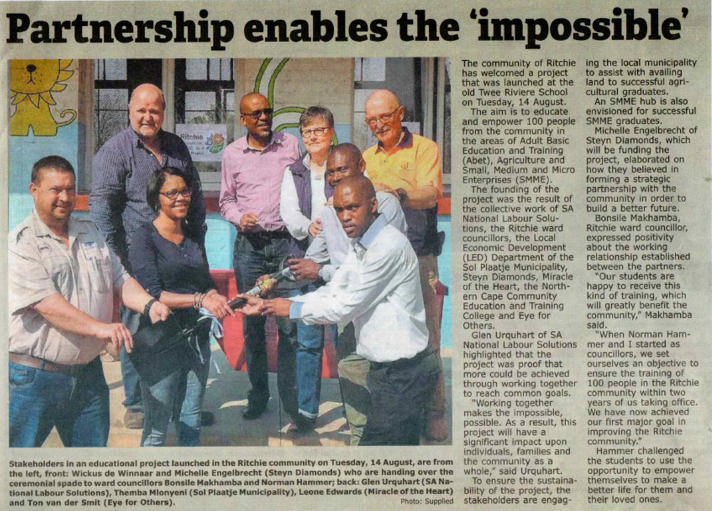 We held the launch of Steyn Diamonds SLP project in Ritchie in the Northern Cape. As porject managers of the project we did all the liason between the Local Municipality and the community in setting the project up. We then conducted all the training for the community which involved the following programmes: